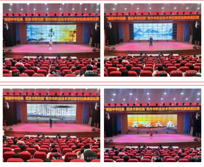 为进一步弘扬中华优秀传统文化,营造书香校园,丰富学校人文底蕴,提高学生的文化素质和道德修养,11月3日下午,焦作市职业技术学校团委在学术报告厅举办了以“诵读中华经典 营造书香校园”为主题的国学经典诵读比赛。校党委书记吴林强、纪委书记慕小永、副校长张涛等领导出席,相关科室负责人、各学部团总支书记及300余名青年学生共同参加了本次比赛。
